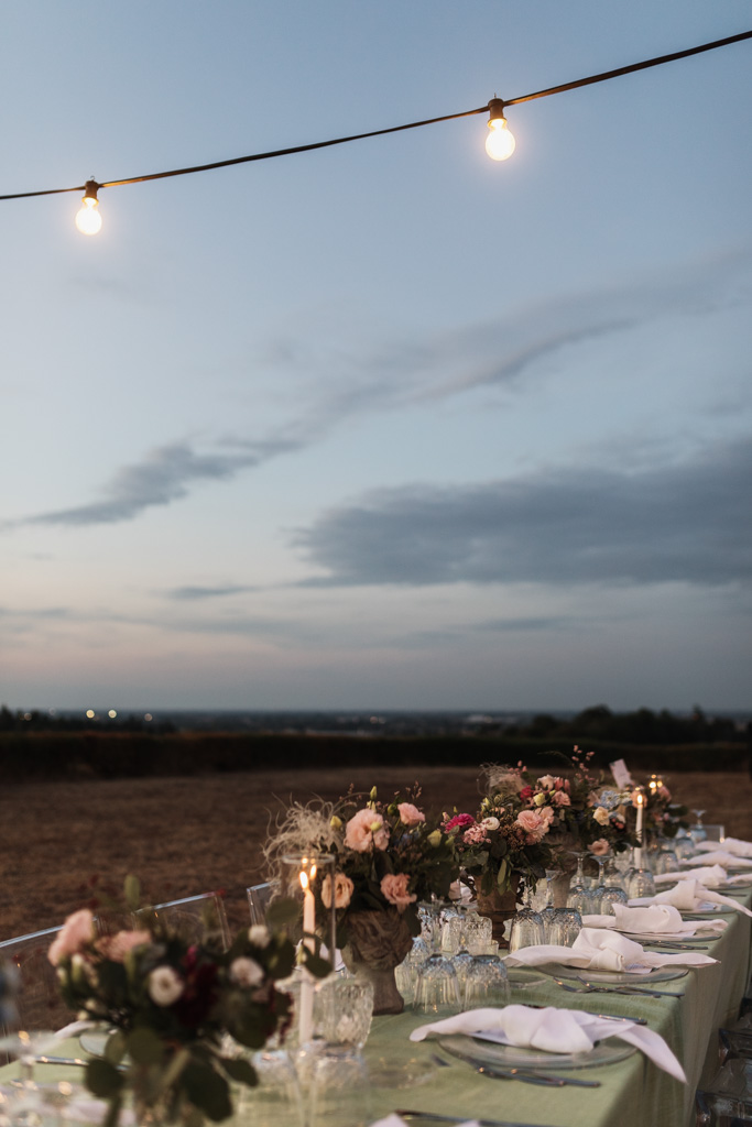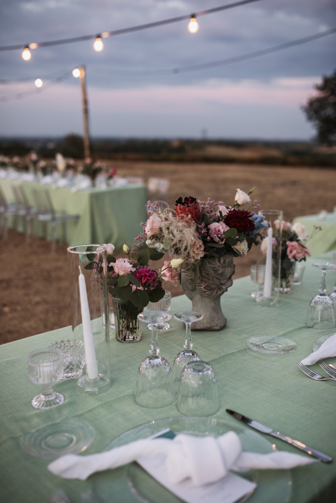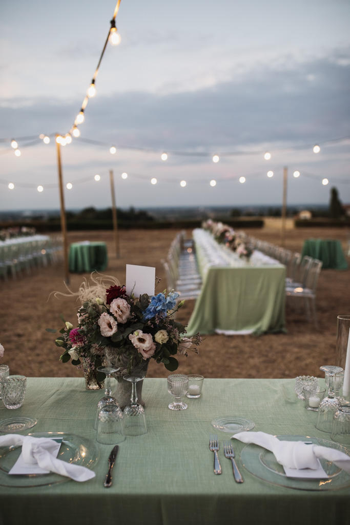 L’allestimento, caratterizzato dal tovagliato verde, dalle teste fiorite in toni delicati, dal cielo stellato, ha dato decisamente un tocco originale e molto elegante allo spazio dedicato alla cena.